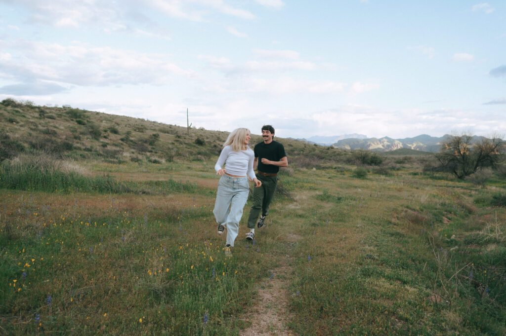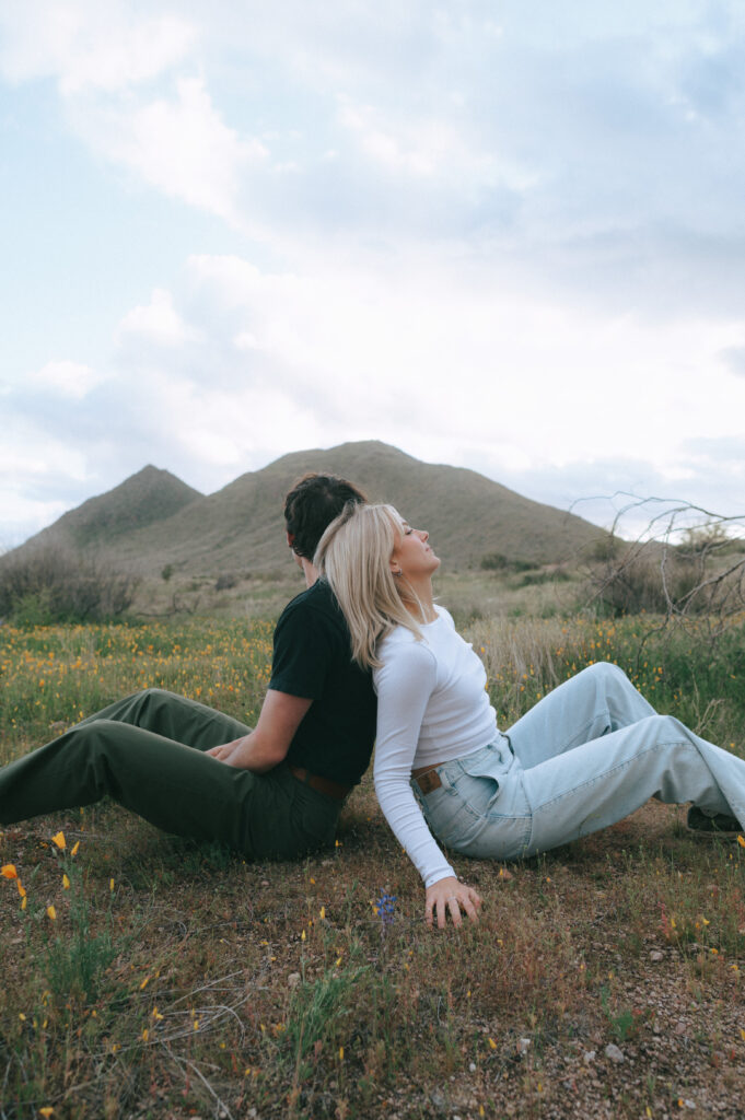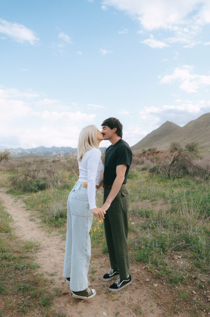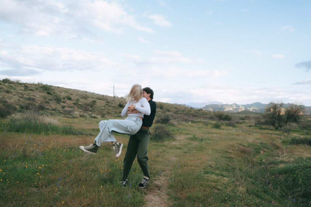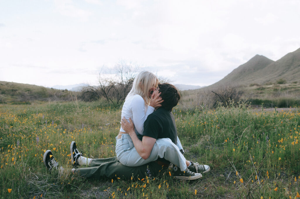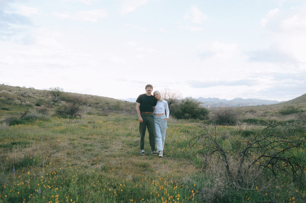 If you are wanting a different type of scenery as far photos go within’ the valley, Bush Highway is beautiful. Bush Highway is all along the Salt River and Saguaro Lake, it’s truly just a beautiful drive if you are wanting something to do on a Sunday evening. This Bush Highway couples session with Charlotte and Frankie was MAGICAL. It was the middle of Spring and all the wildflowers were blooming, it was so pretty! We had two locations planned out for their session, the wildflowers and this little spot I found along the highway that gave a pretty awesome view of some mountains right along the Salt River.